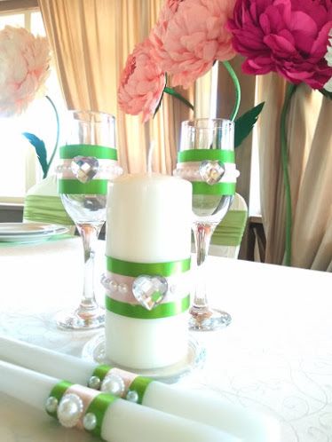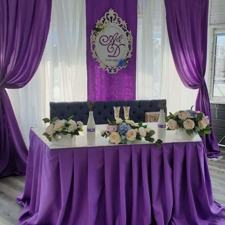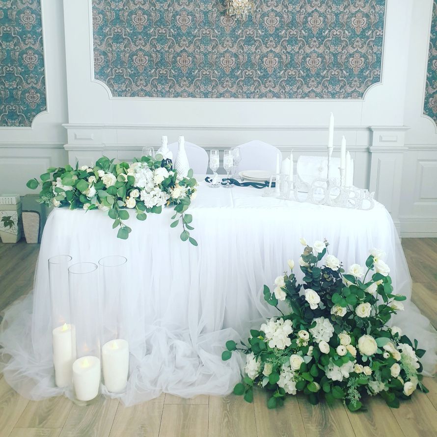 Декор стола Молодых: банкетный текстиль в цвет свадьбы, флористика, подсветка, статуэтки, свечи и др.